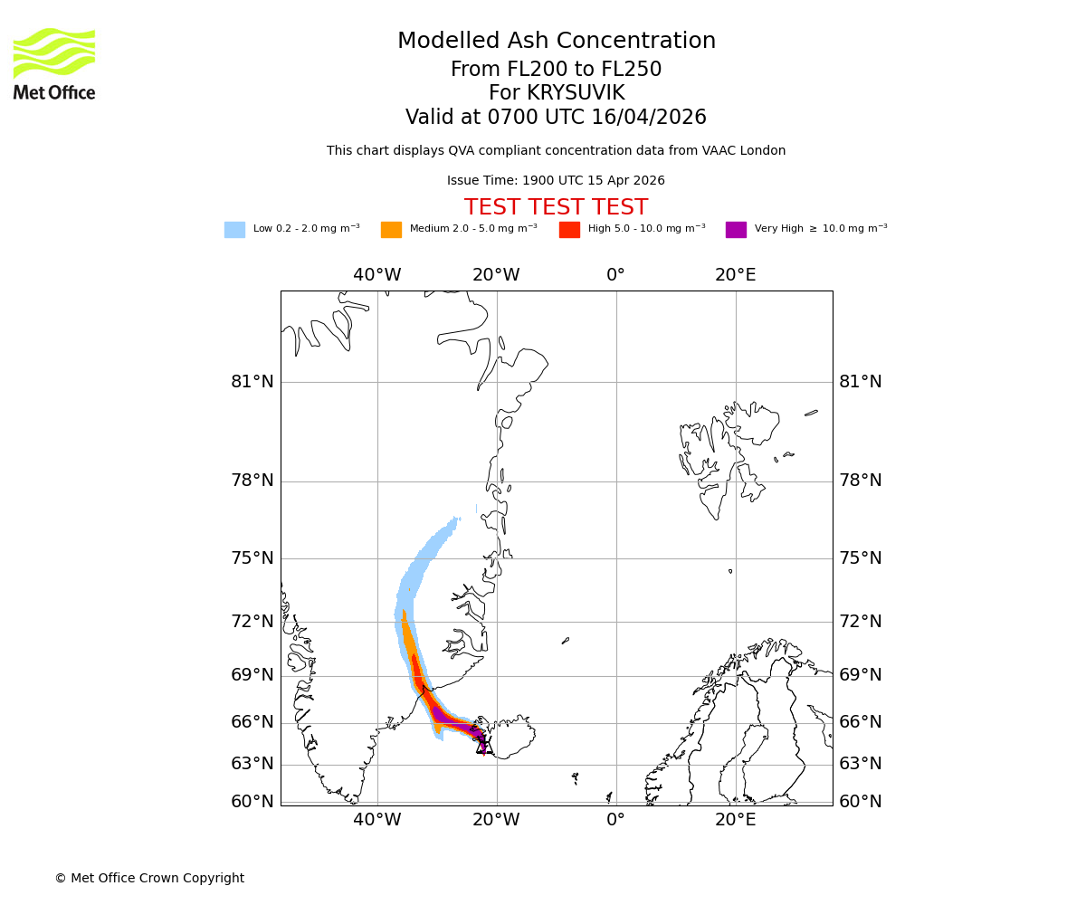 Modelled ash concentration from 200 to 250 for KRYSUVIK. Valid at 0400 UTC 16/04/2026