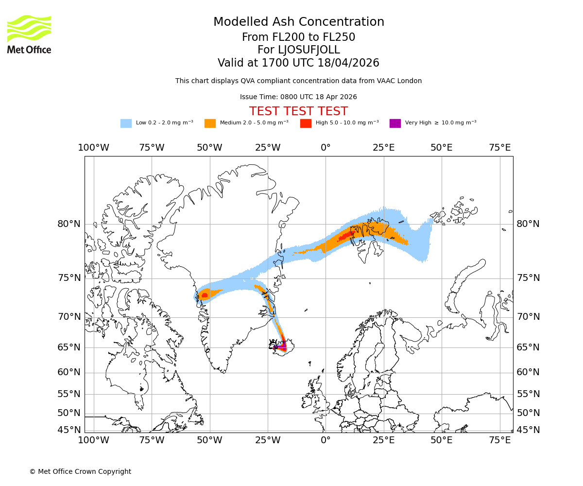 Modelled ash concentration from 000 to 200 for LJOSUFJOLL. Valid at 0800 UTC 18/04/2026