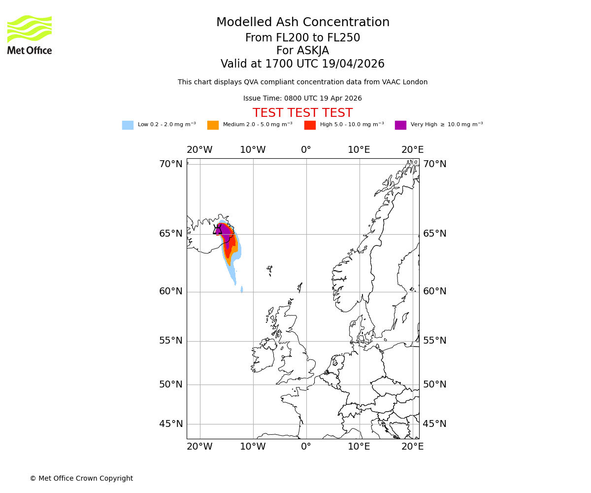 Modelled ash concentration from 200 to 250 for ASKJA. Valid at 1400 UTC 19/04/2026