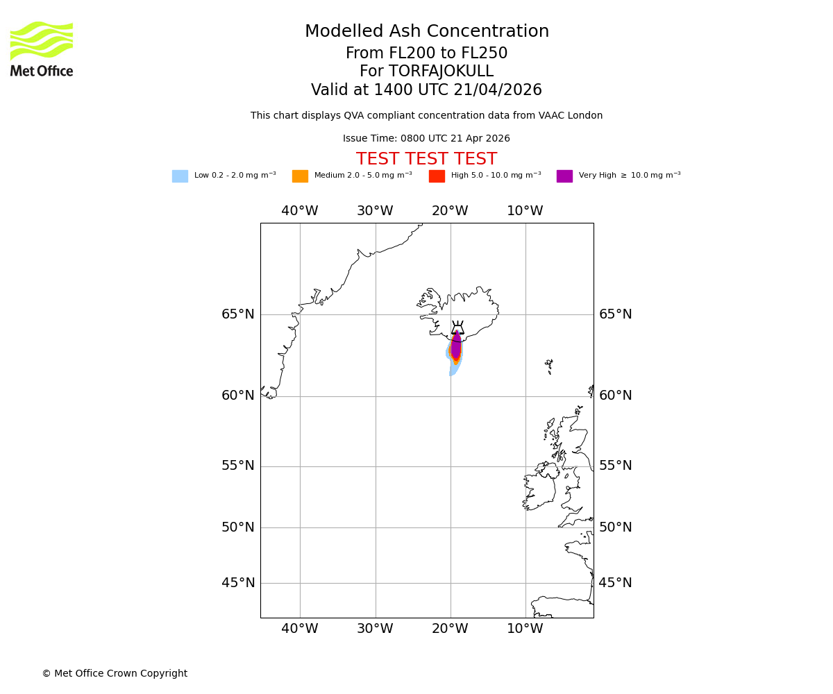 Modelled ash concentration from 200 to 250 for TORFAJOKULL. Valid at 1100 UTC 21/04/2026