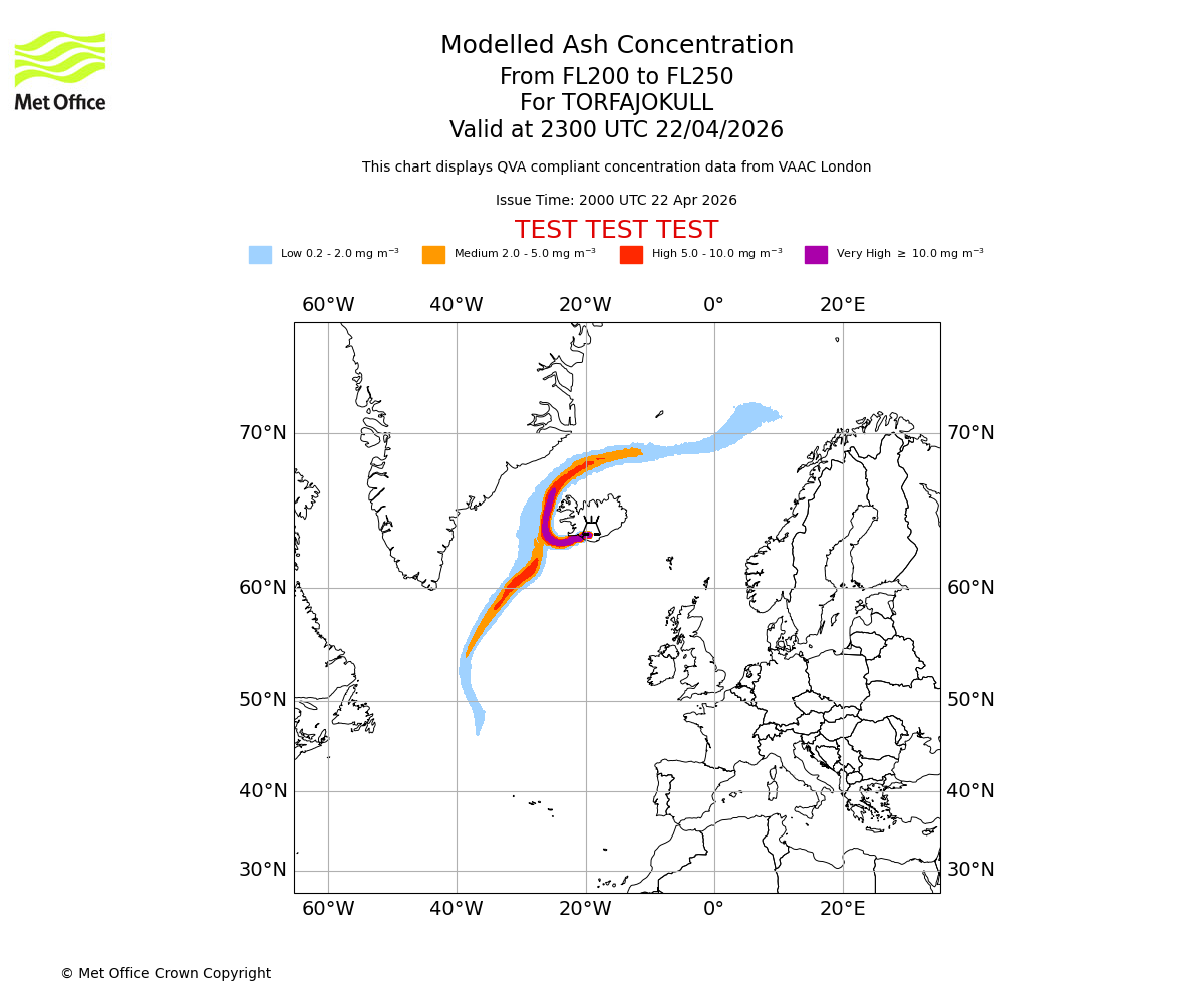 Modelled ash concentration from 200 to 250 for TORFAJOKULL. Valid at 2000 UTC 22/04/2026