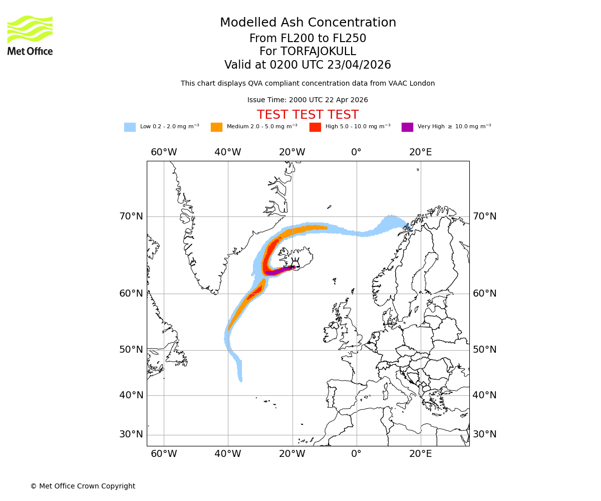 Modelled ash concentration from 200 to 250 for TORFAJOKULL. Valid at 2300 UTC 22/04/2026