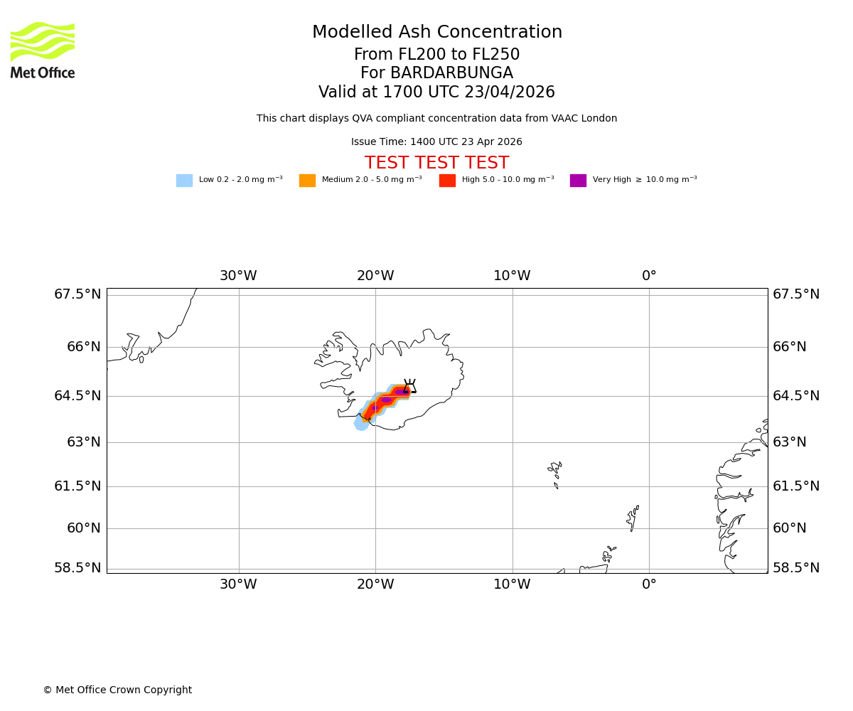 Modelled ash concentration from 200 to 250 for BARDARBUNGA. Valid at 1400 UTC 23/04/2026