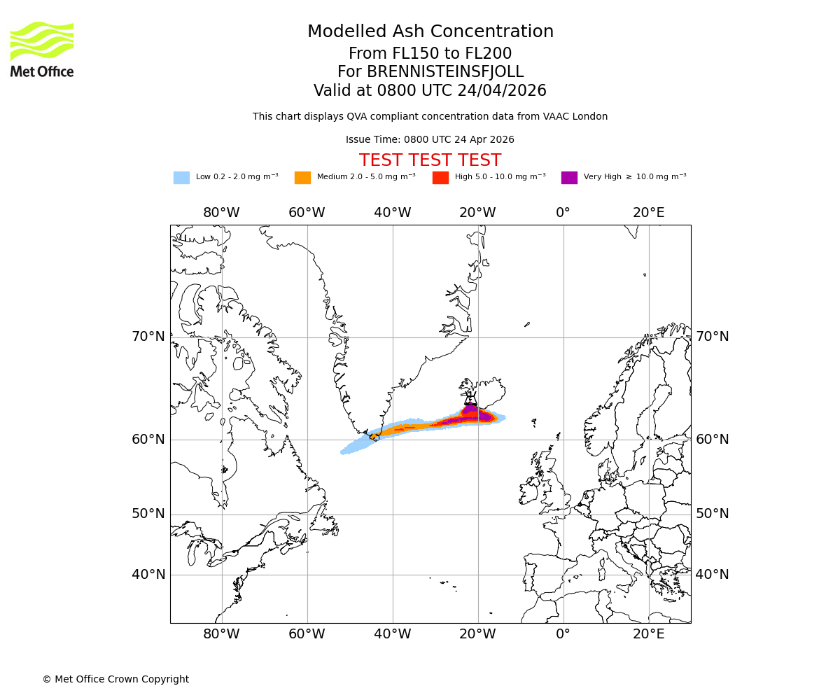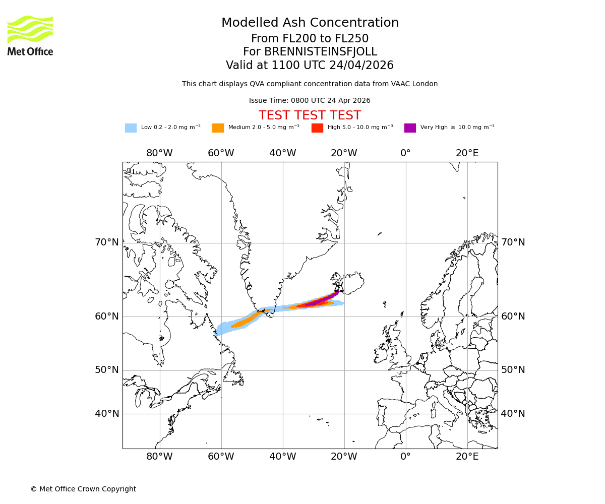 Modelled ash concentration from 200 to 250 for BRENNISTEINSFJOLL. Valid at 0800 UTC 24/04/2026