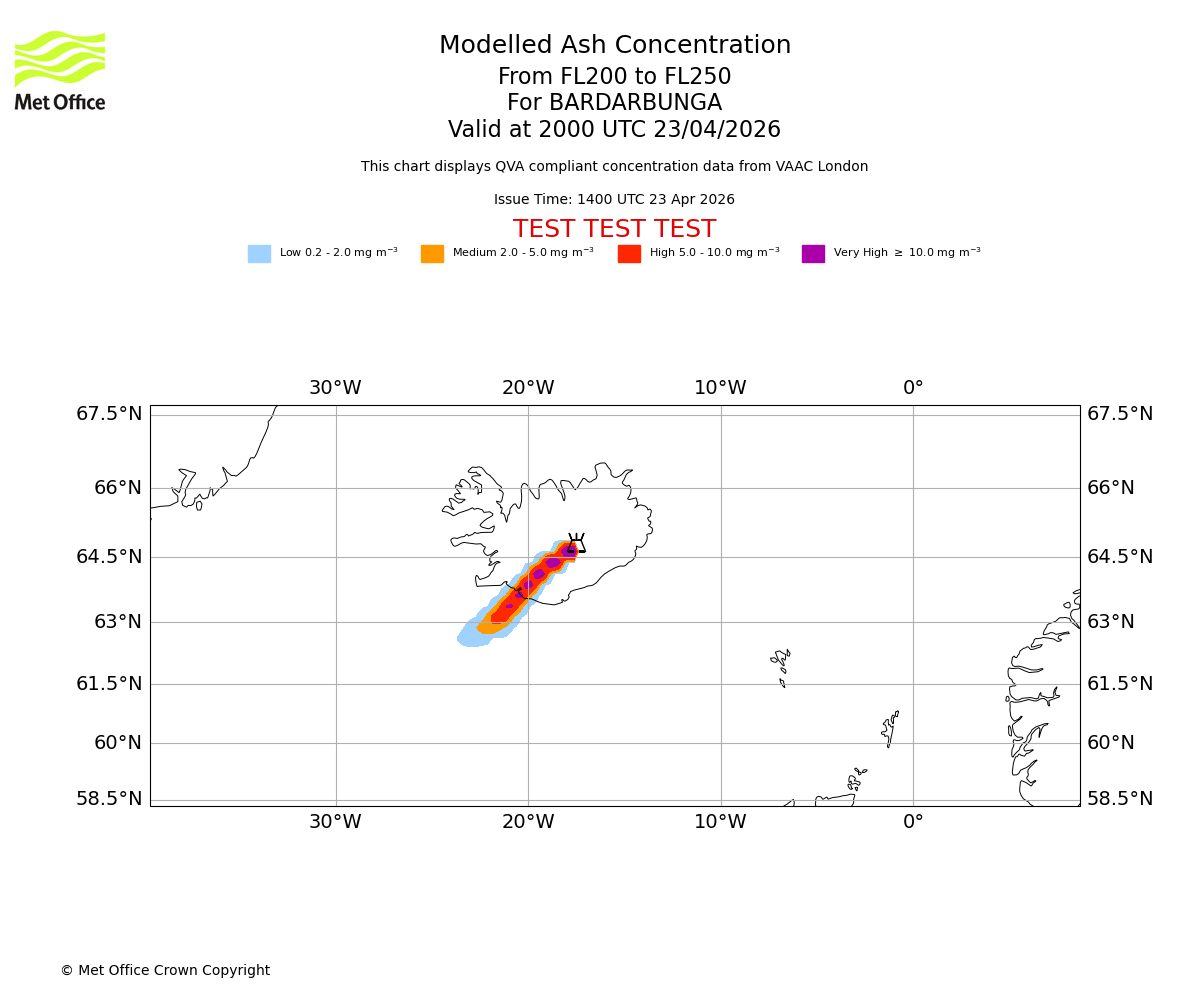 Modelled ash concentration from 000 to 200 for BARDARBUNGA. Valid at 1400 UTC 23/04/2026