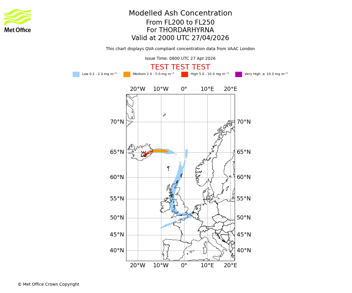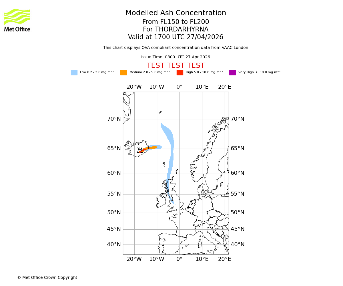 Modelled ash concentration from 200 to 250 for THORDARHYRNA. Valid at 1700 UTC 27/04/2026