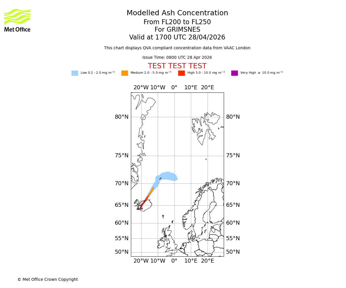 Modelled ash concentration from 200 to 250 for GRIMSNES. Valid at 1400 UTC 28/04/2026