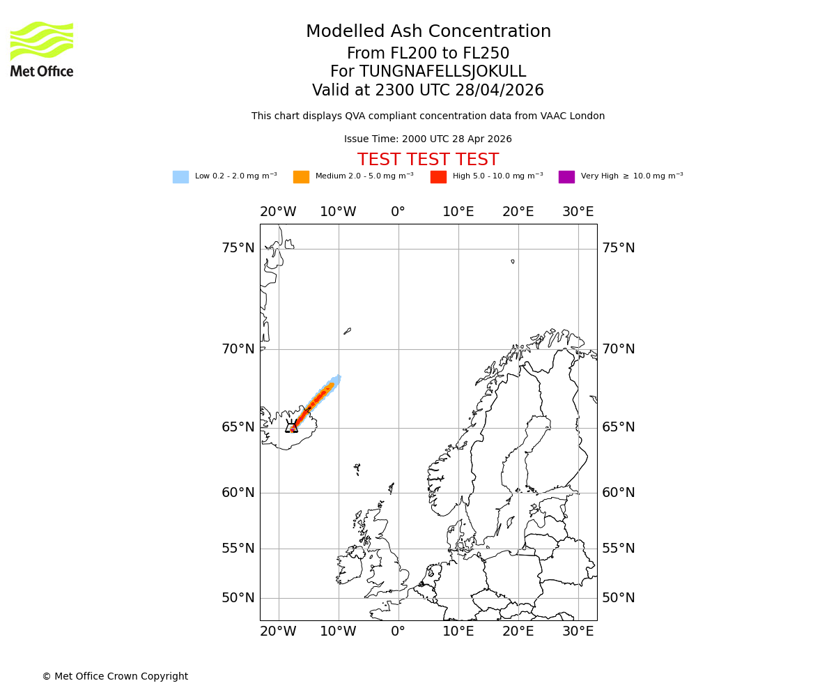 Modelled ash concentration from 200 to 250 for TUNGNAFELLSJOKULL. Valid at 2000 UTC 28/04/2026