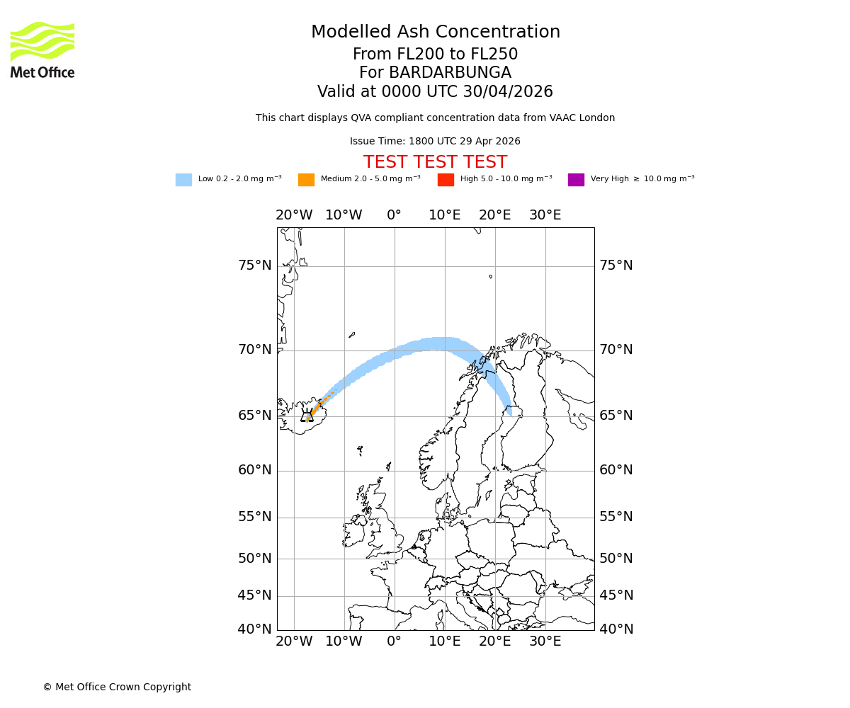 Modelled ash concentration from 200 to 250 for BARDARBUNGA. Valid at 2100 UTC 29/04/2026