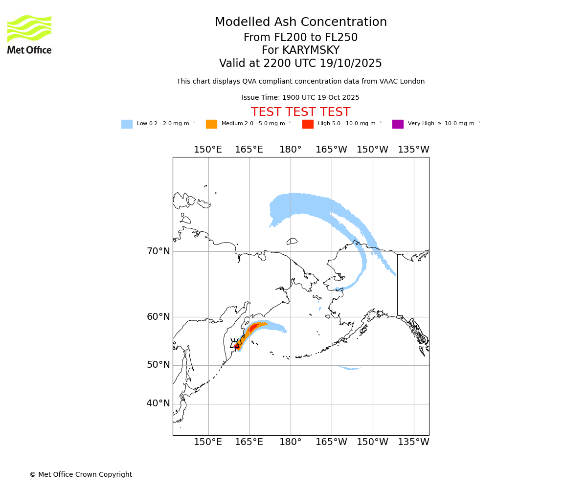 Modelled ash concentration from 200 to 250 for KARYMSKY. Valid at 1900 UTC 19/10/2025