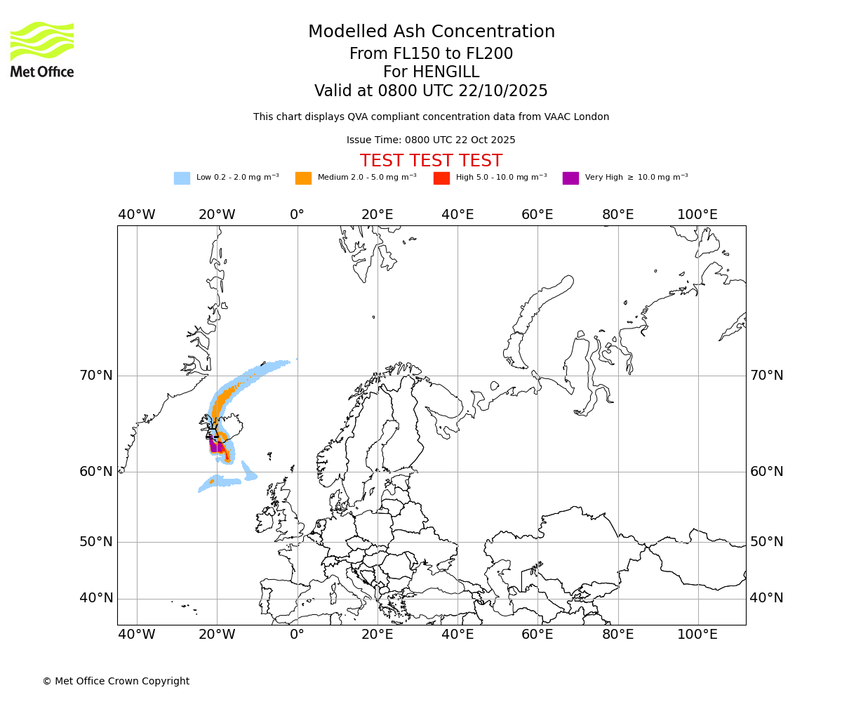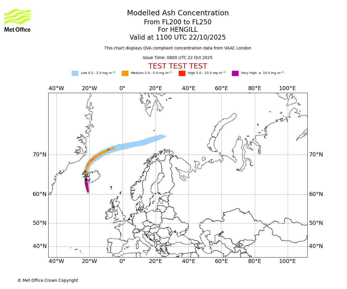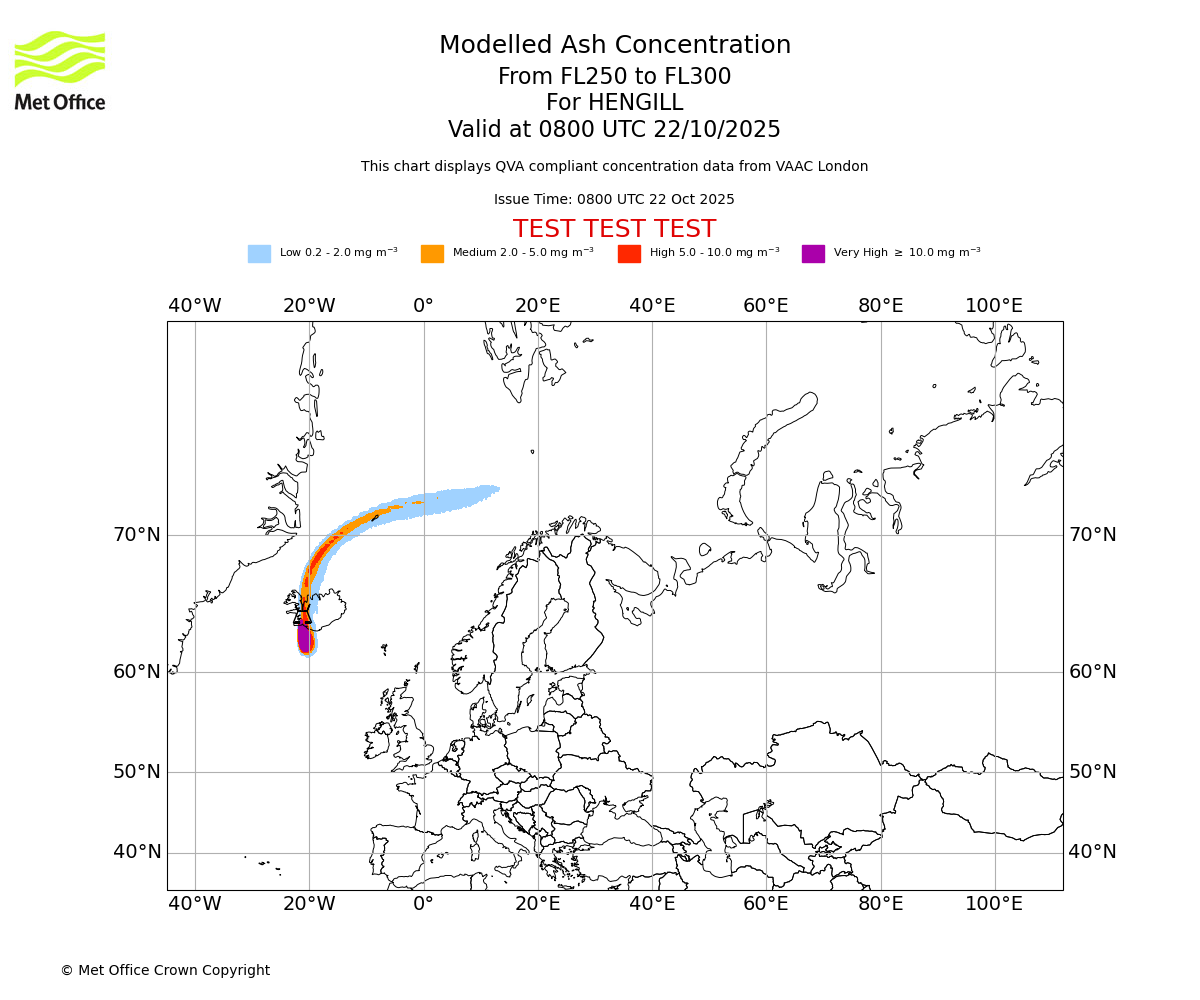 Modelled ash concentration from 200 to 250 for HENGILL. Valid at 0800 UTC 22/10/2025
