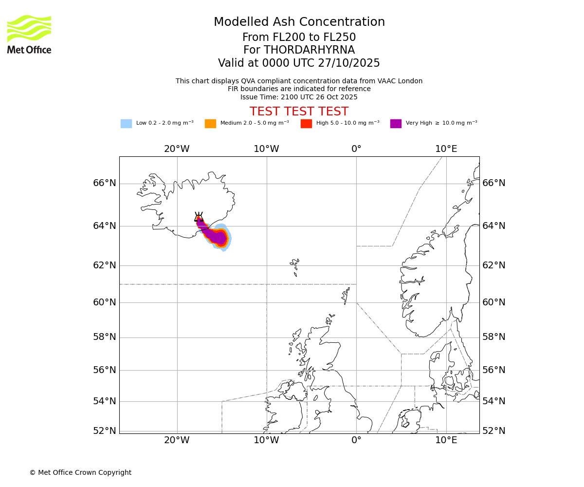 Modelled ash concentration from 200 to 250 for THORDARHYRNA. Valid at 2100 UTC 26/10/2025