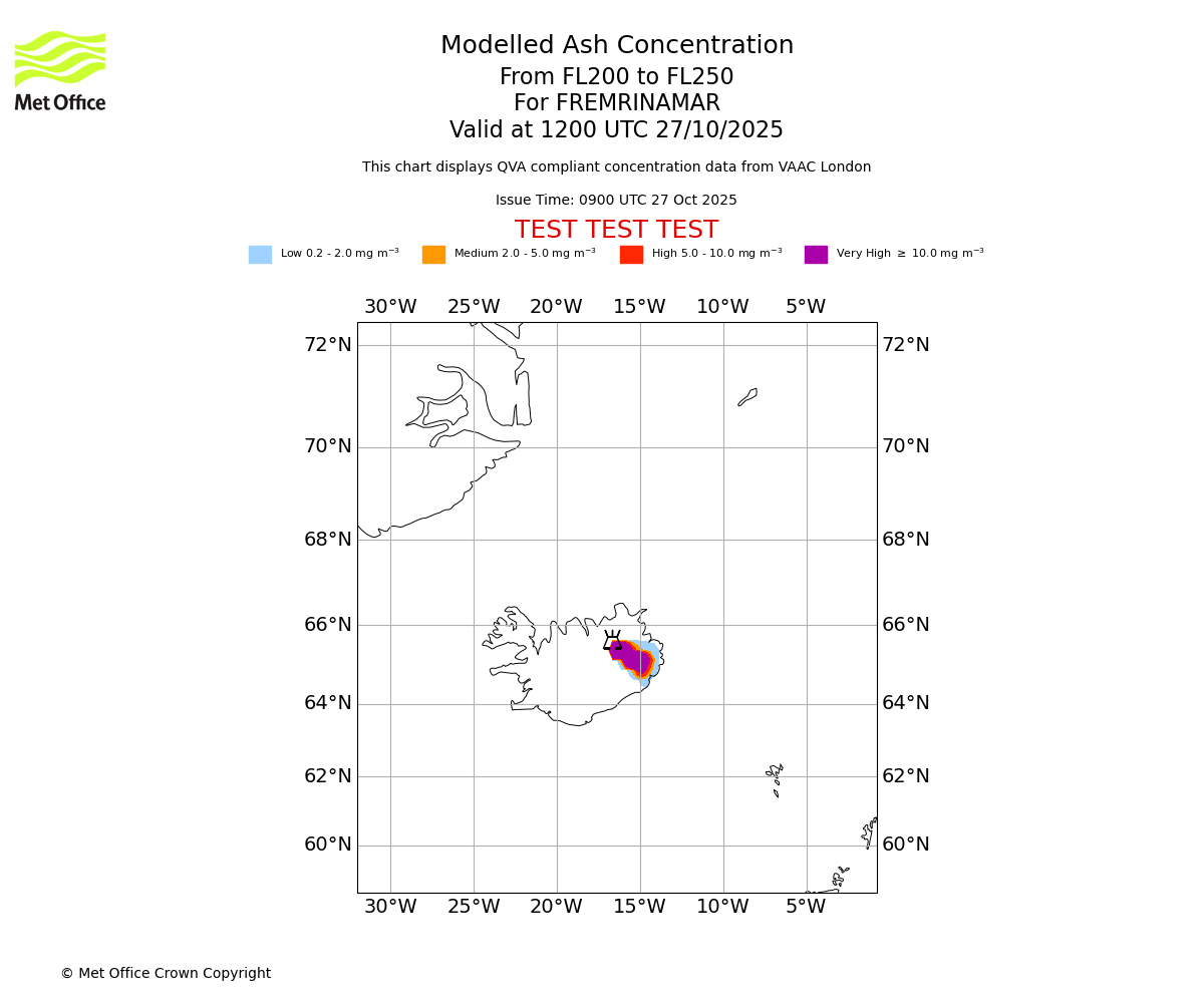 Modelled ash concentration from 200 to 250 for FREMRINAMAR. Valid at 0900 UTC 27/10/2025