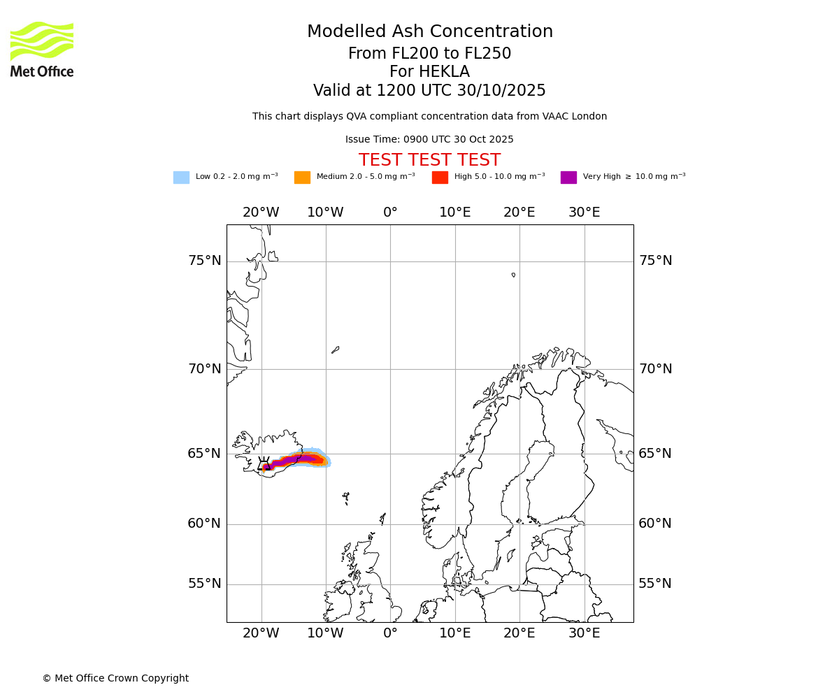 Modelled ash concentration from 200 to 250 for HEKLA. Valid at 0900 UTC 30/10/2025