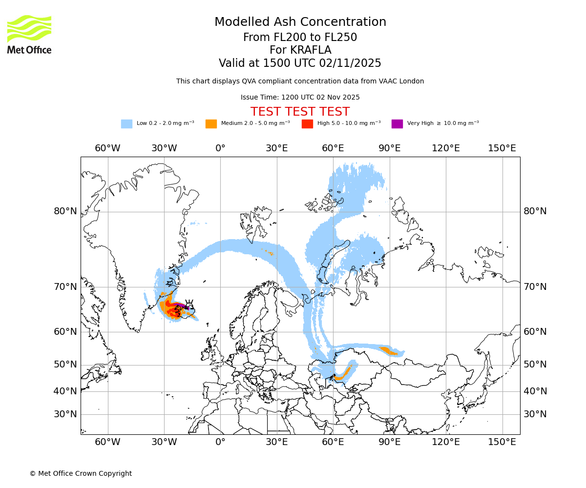 In accordance with ICAO Annex 3, Amendment 82 VAAC London will provide operational QVA forecasts from 27 November 2025 and these will be made available via a VAAC London QVA API information service. These charts are currently provided for test and evaluation purposes (not for operational use) until the introduction of the operational service.