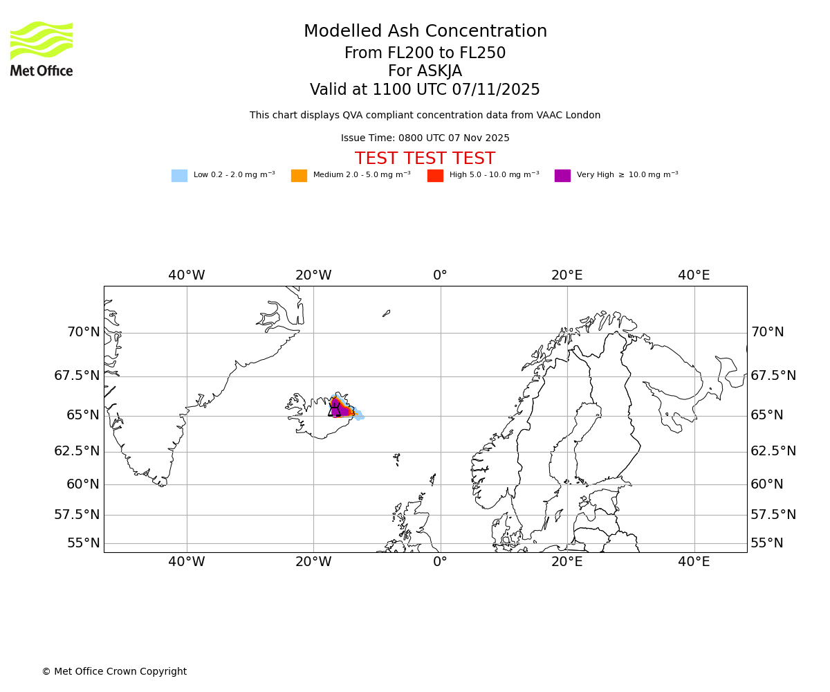 Modelled ash concentration from 200 to 250 for ASKJA. Valid at 0800 UTC 07/11/2025