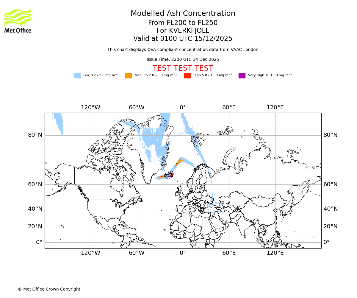Modelled ash concentration from 200 to 250 for KVERKFJOLL. Valid at 2200 UTC 14/12/2025