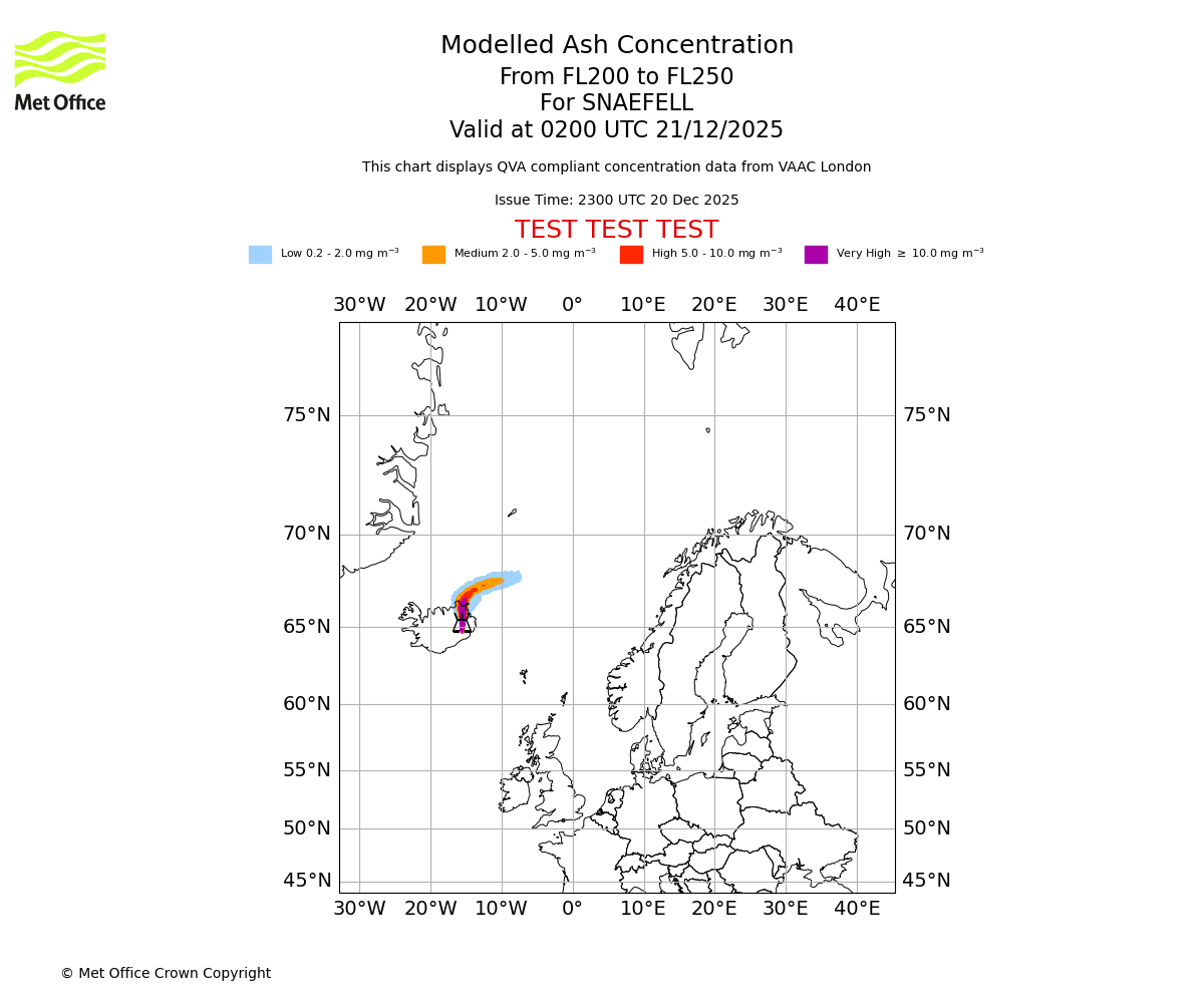 Modelled ash concentration from 200 to 250 for SNAEFELL. Valid at 2300 UTC 20/12/2025
