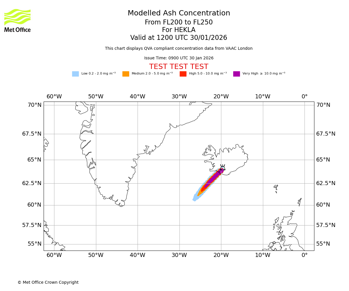 Modelled ash concentration from 200 to 250 for HEKLA. Valid at 0900 UTC 30/01/2026