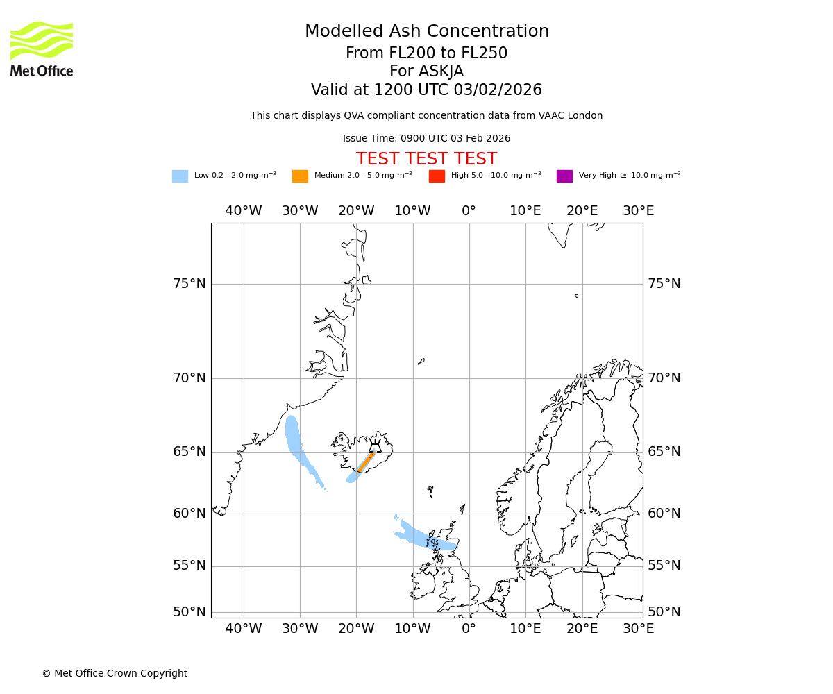 Modelled ash concentration from 200 to 250 for ASKJA. Valid at 0900 UTC 03/02/2026