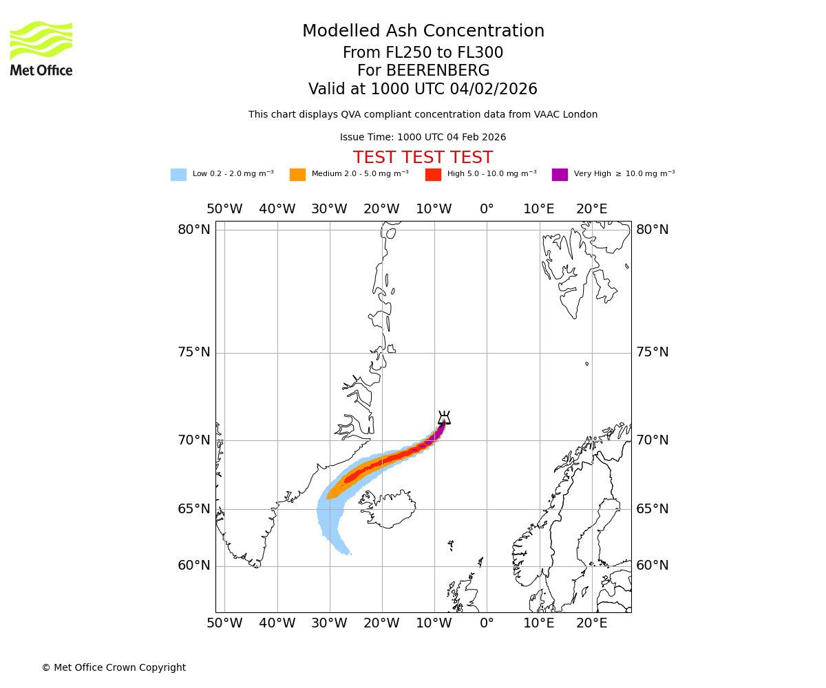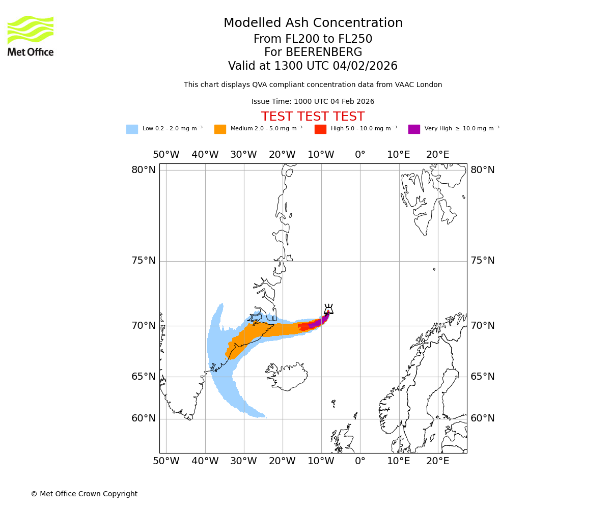 Modelled ash concentration from 200 to 250 for BEERENBERG. Valid at 1000 UTC 04/02/2026