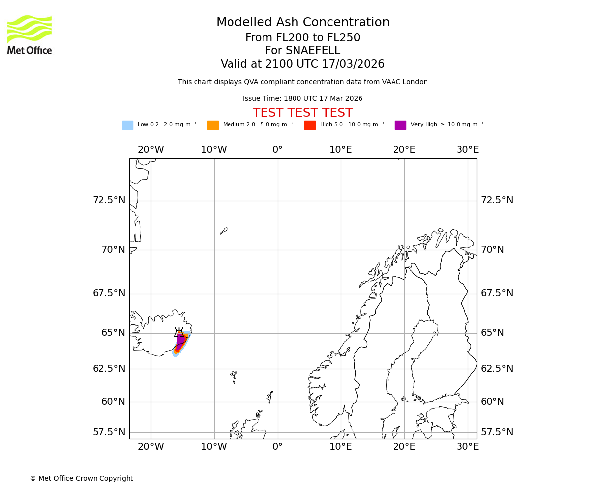 Modelled ash concentration from 200 to 250 for SNAEFELL. Valid at 1800 UTC 17/03/2026
