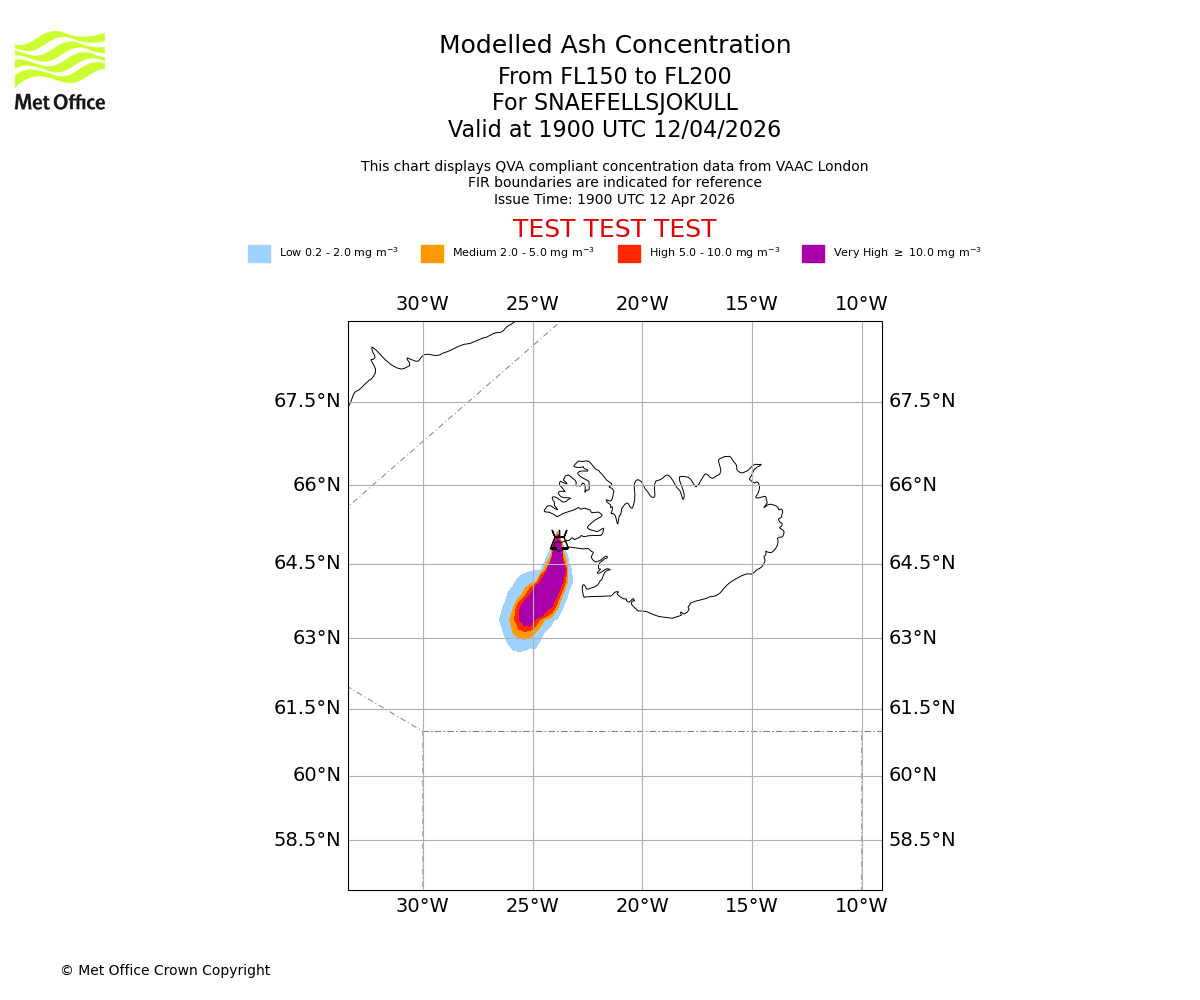 Modelled ash concentration from 200 to 250 for SNAEFELLSJOKULL. Valid at 1900 UTC 12/04/2026