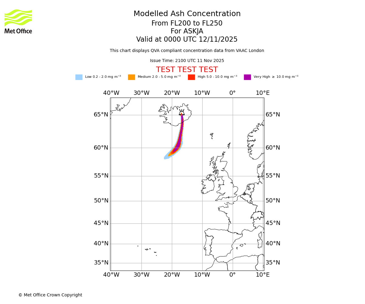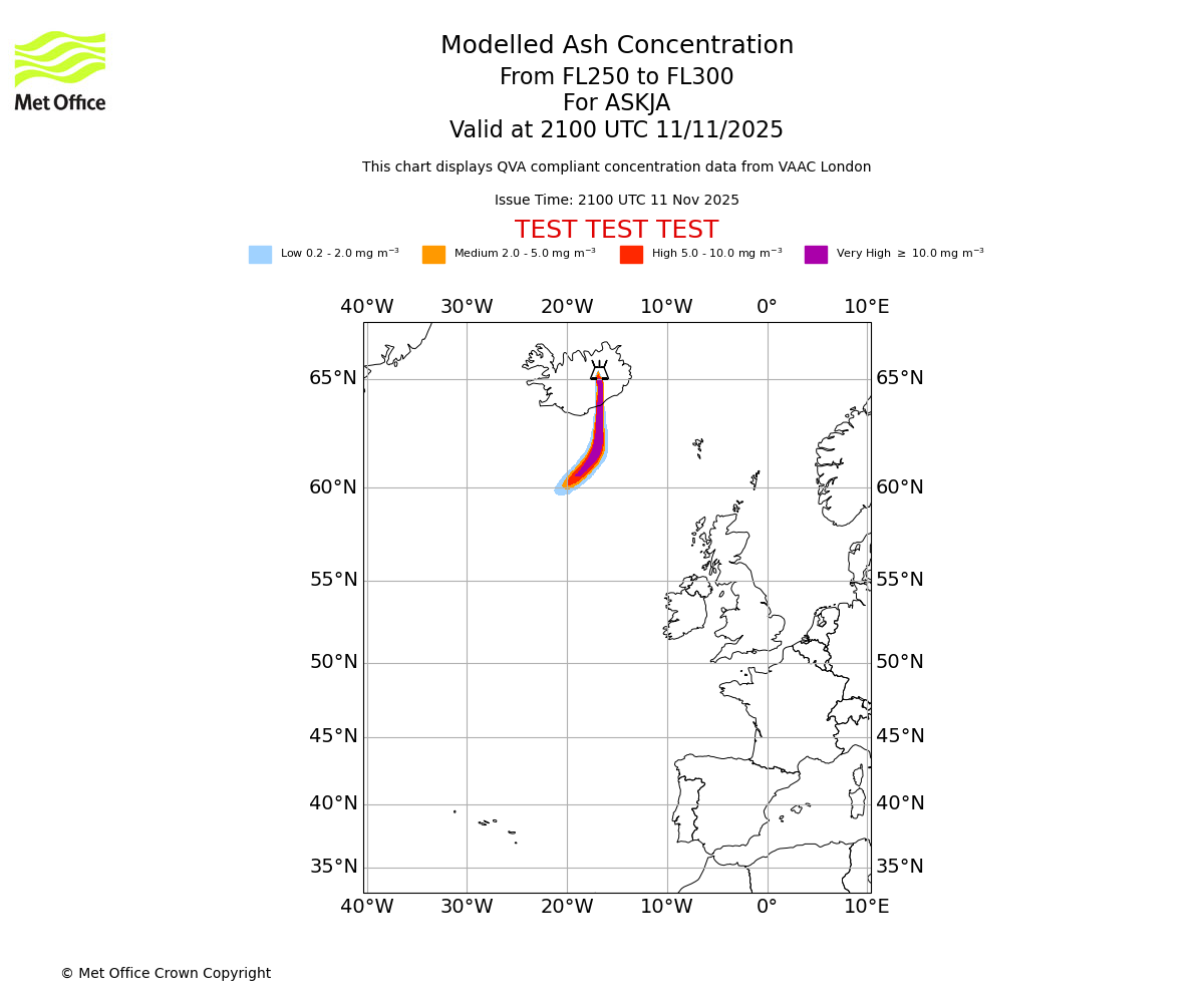 In accordance with ICAO Annex 3, Amendment 82 VAAC London will provide operational QVA forecasts from 27 November 2025 and these will be made available via a VAAC London QVA API information service. These charts are currently provided for test and evaluation purposes (not for operational use) until the introduction of the operational service.