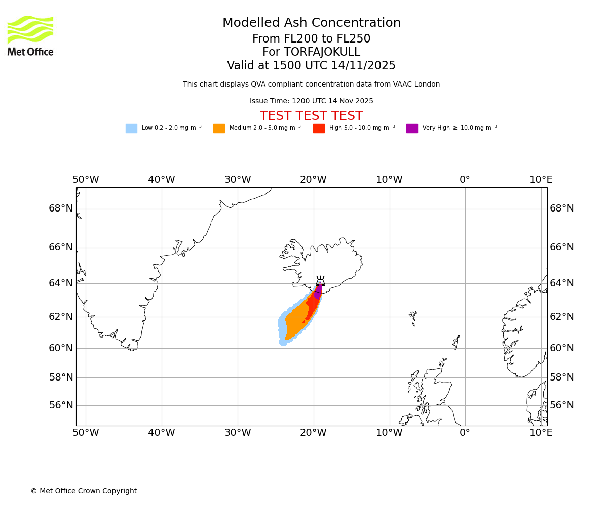 Modelled ash concentration from 200 to 250 for TORFAJOKULL. Valid at 1200 UTC 14/11/2025