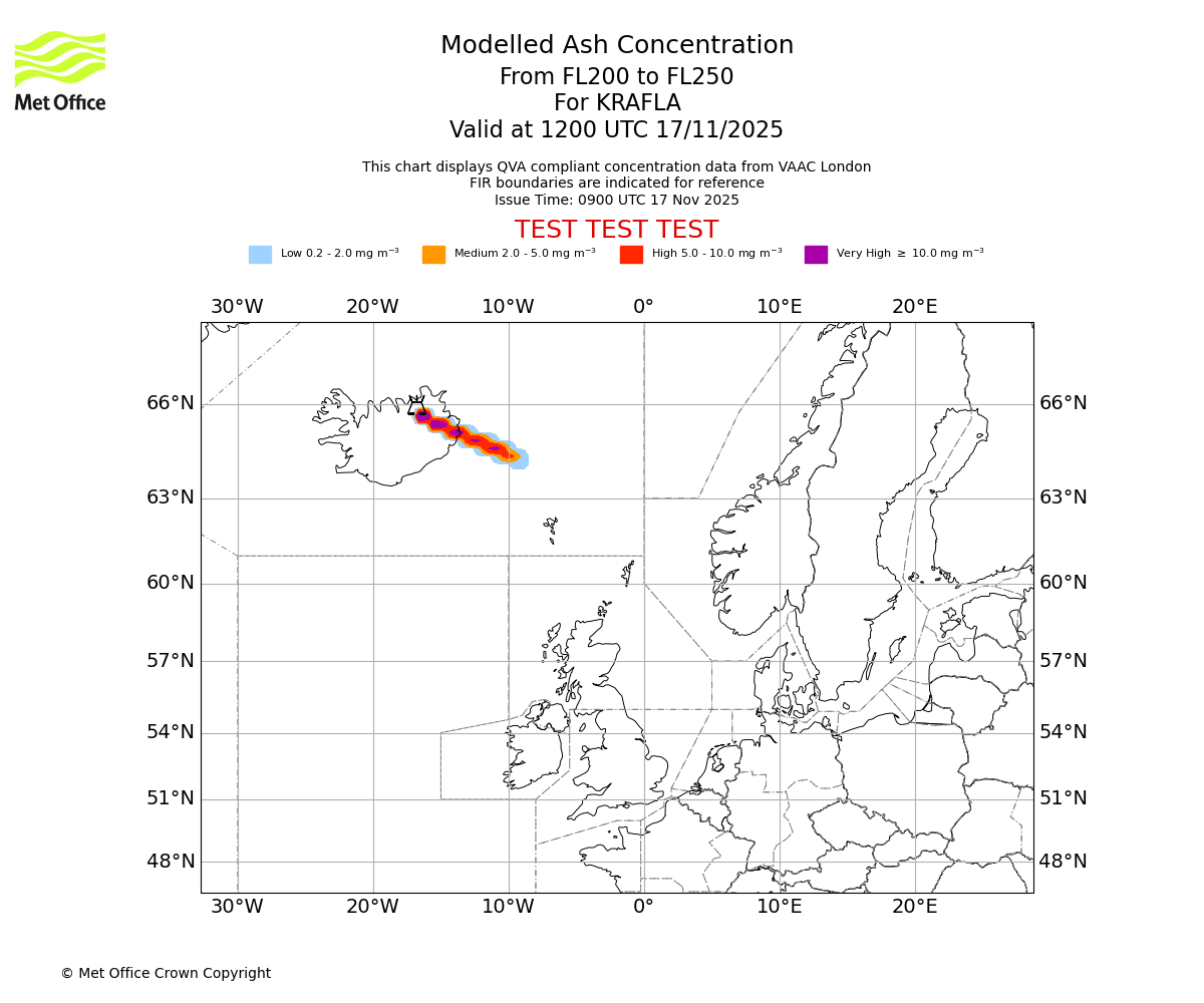 Modelled ash concentration from 200 to 250 for KRAFLA. Valid at 0900 UTC 17/11/2025