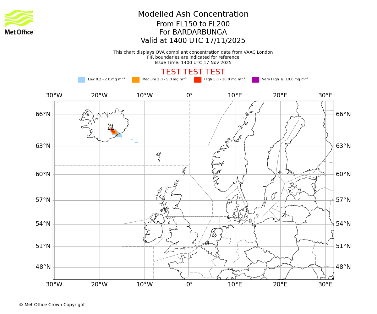 Modelled ash concentration from 000 to 200 for BARDARBUNGA. Valid at 1400 UTC 17/11/2025