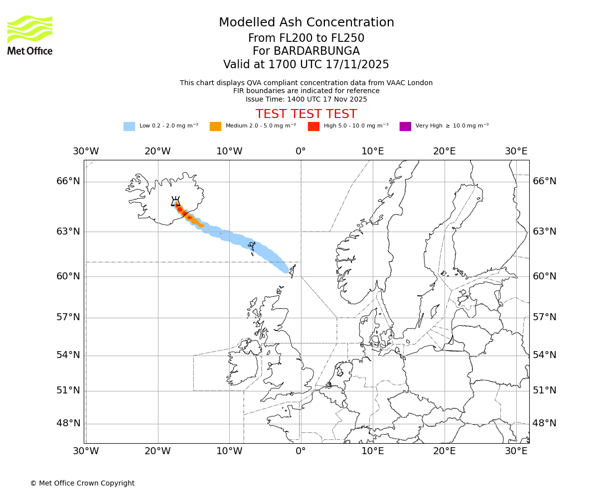 Modelled ash concentration from 200 to 250 for BARDARBUNGA. Valid at 1400 UTC 17/11/2025