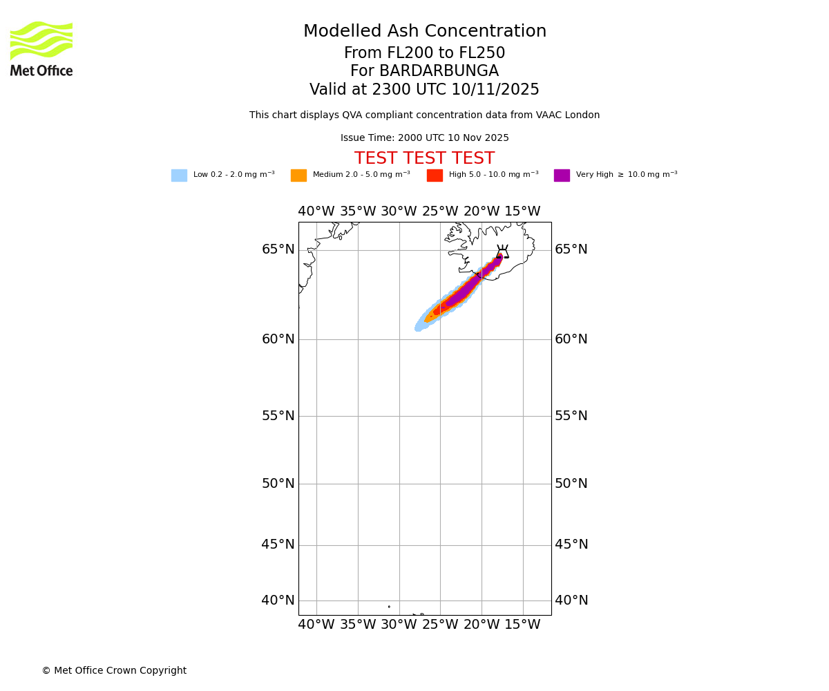 Modelled ash concentration from 200 to 250 for BARDARBUNGA. Valid at 2000 UTC 10/11/2025