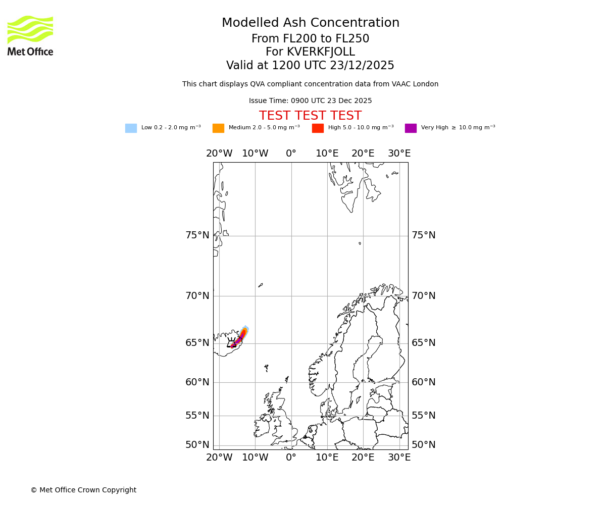 Modelled ash concentration from 200 to 250 for KVERKFJOLL. Valid at 0900 UTC 23/12/2025