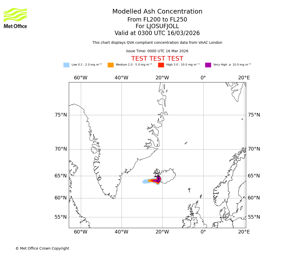 Modelled ash concentration from 200 to 250 for LJOSUFJOLL. Valid at 0000 UTC 16/03/2026