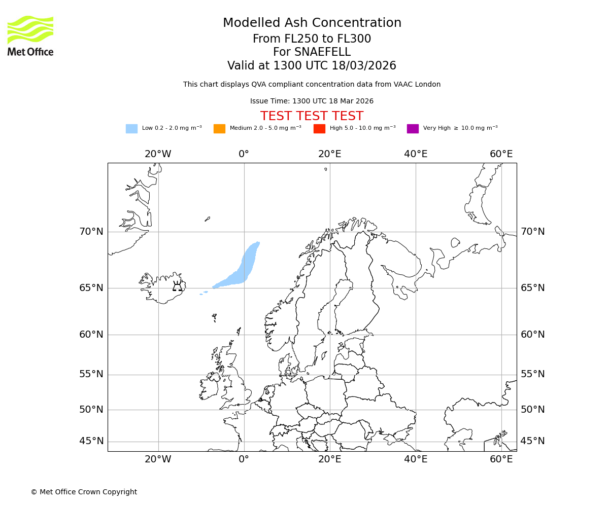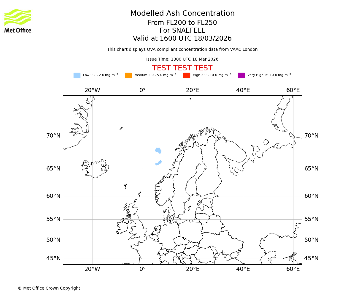 Modelled ash concentration from 200 to 250 for SNAEFELL. Valid at 1300 UTC 18/03/2026