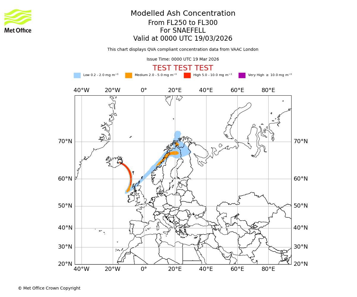 Modelled ash concentration from 200 to 250 for SNAEFELL. Valid at 0000 UTC 19/03/2026