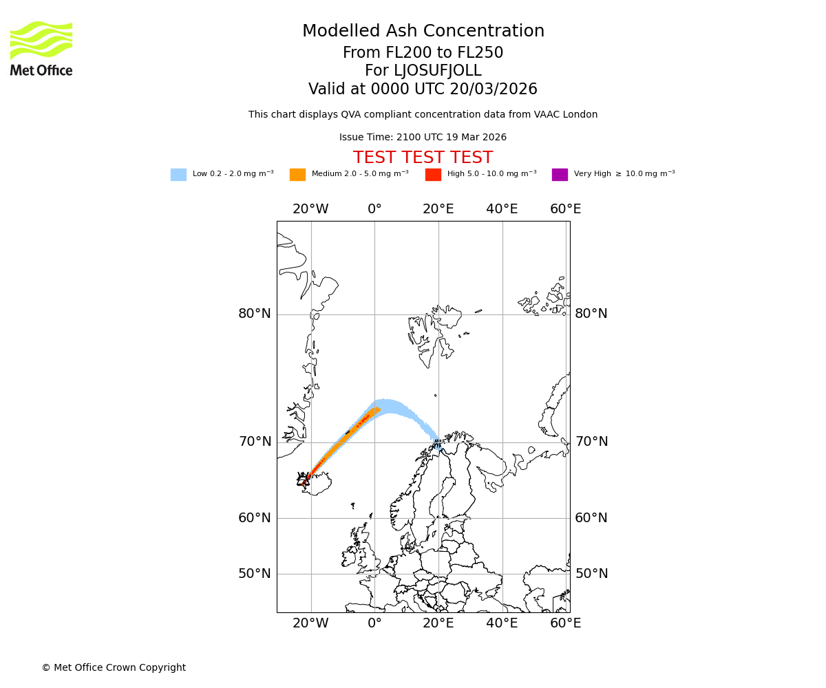 Modelled ash concentration from 200 to 250 for LJOSUFJOLL. Valid at 2100 UTC 19/03/2026