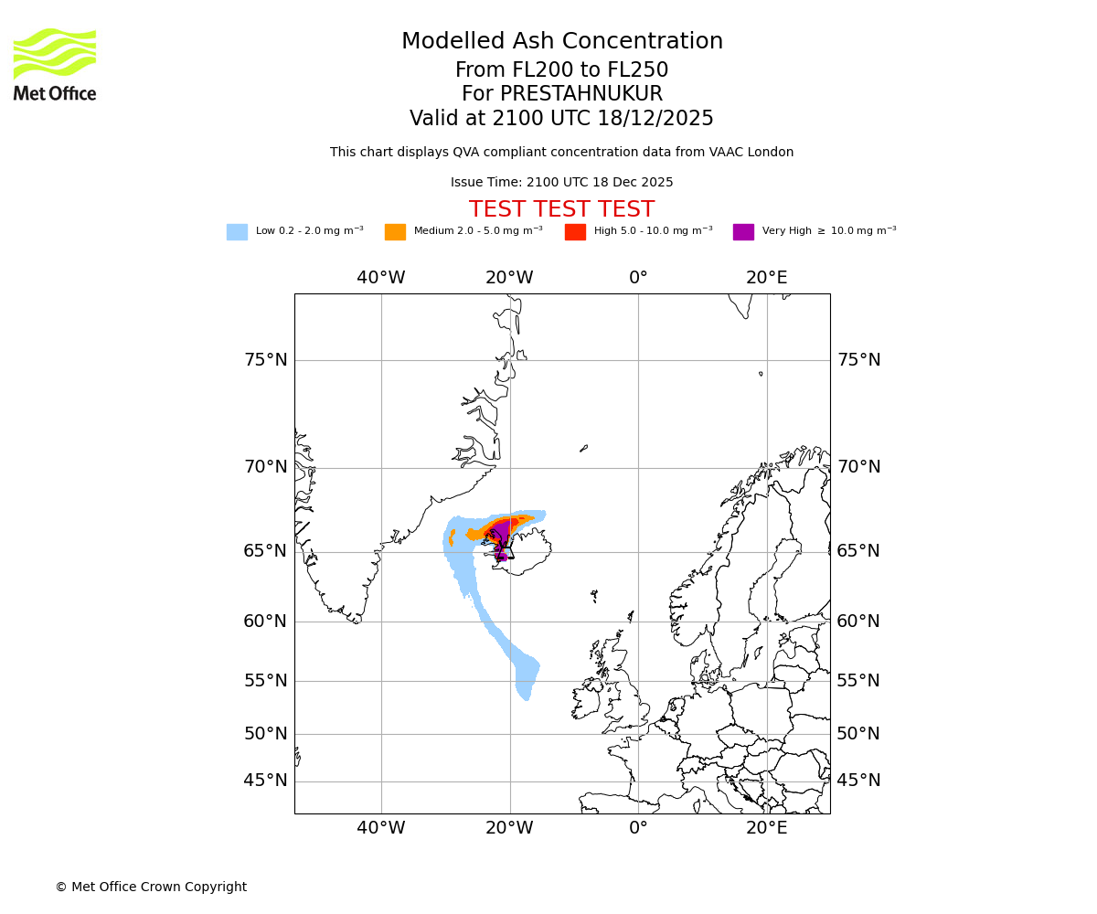 Modelled ash concentration from 250 to 300 for PRESTAHNUKUR. Valid at 2100 UTC 18/12/2025