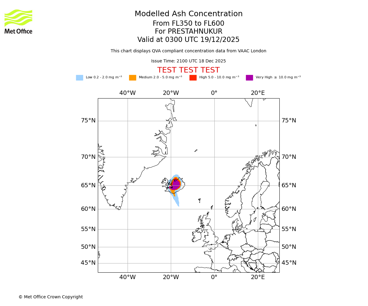 Modelled ash concentration from 350 to 600 for PRESTAHNUKUR. Valid at 2100 UTC 18/12/2025