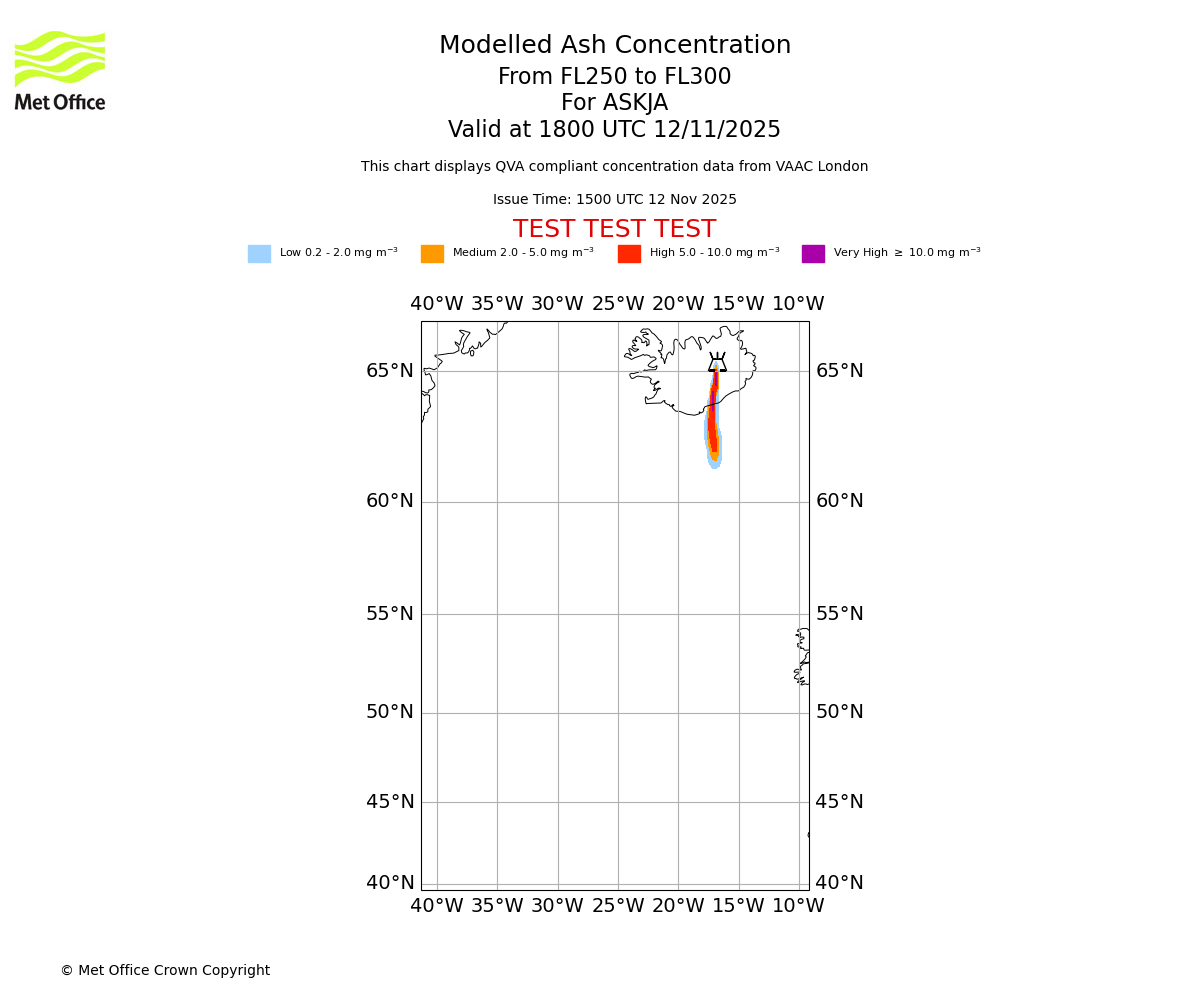 Modelled ash concentration from 250 to 300 for ASKJA. Valid at 1500 UTC 12/11/2025