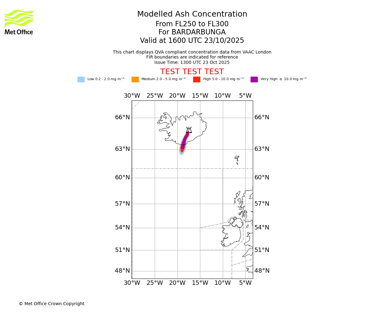 Modelled ash concentration from 250 to 300 for BARDARBUNGA. Valid at 1300 UTC 23/10/2025