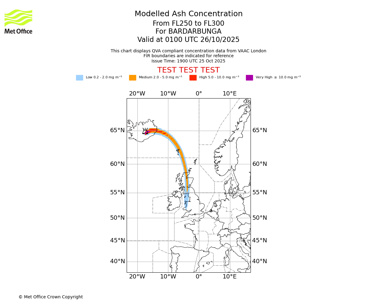 Modelled ash concentration from 250 to 300 for BARDARBUNGA. Valid at 2200 UTC 25/10/2025