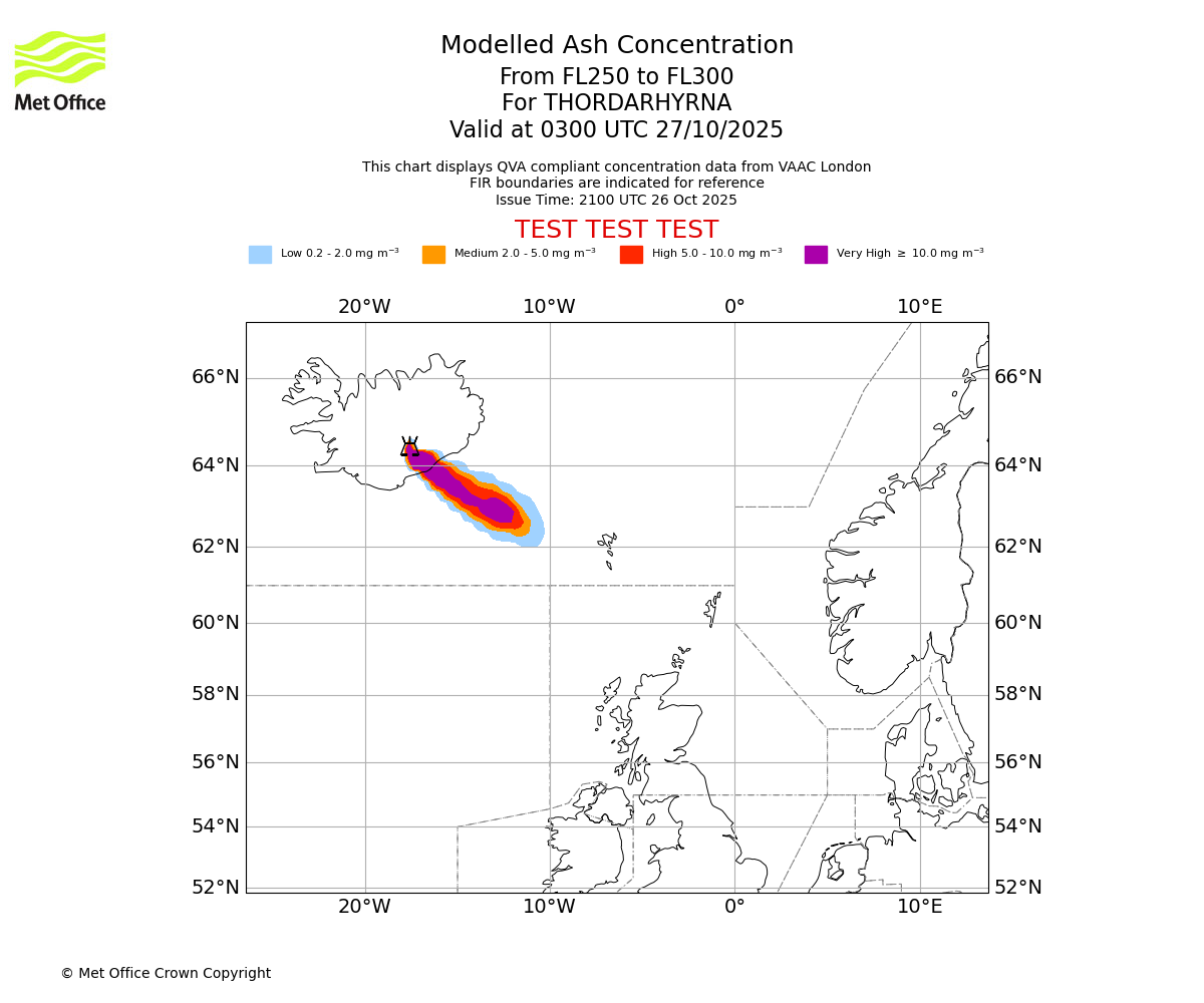 Modelled ash concentration from 250 to 300 for THORDARHYRNA. Valid at 0000 UTC 27/10/2025