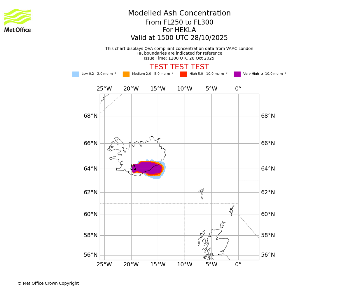 Modelled ash concentration from 250 to 300 for HEKLA. Valid at 1200 UTC 28/10/2025