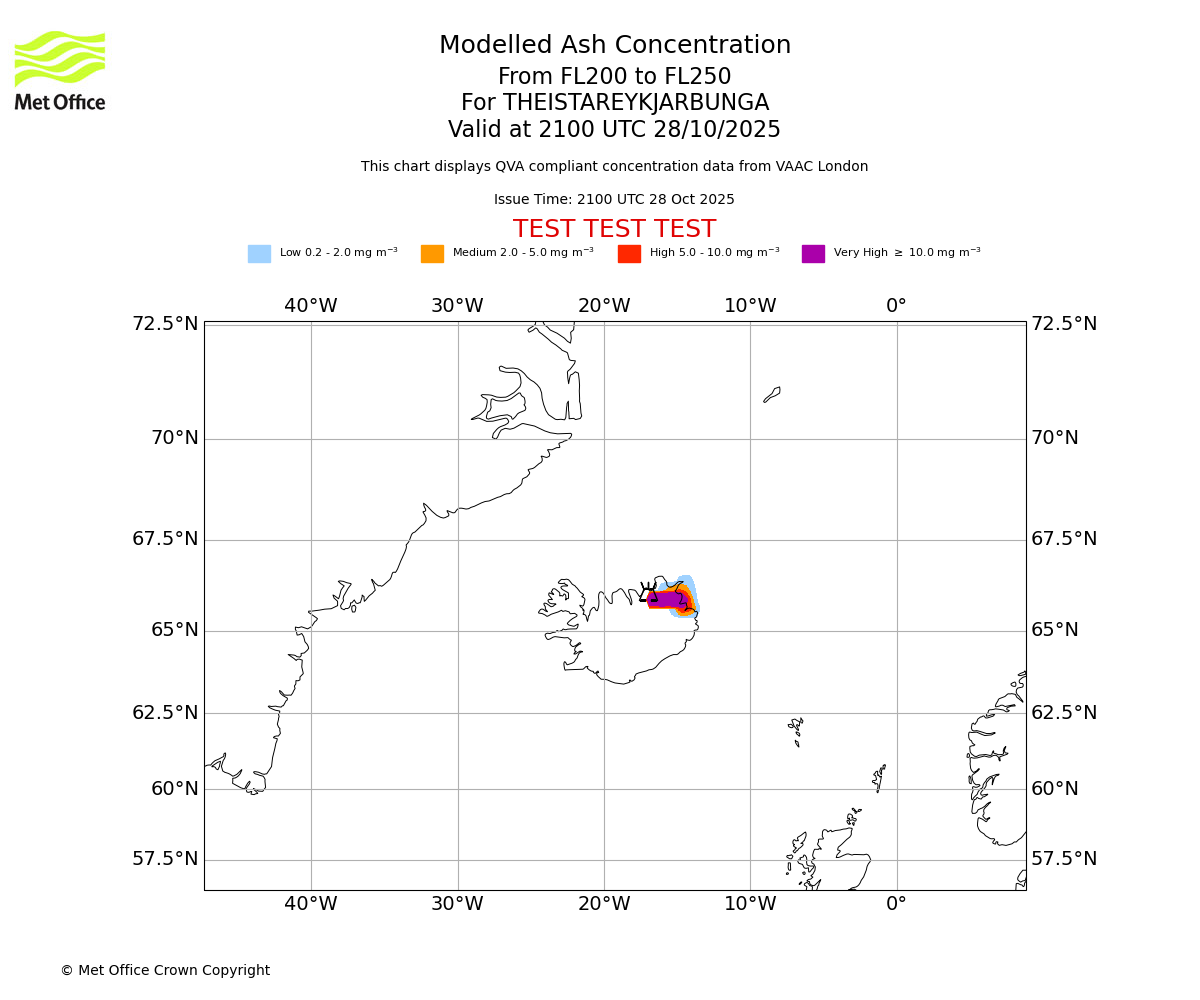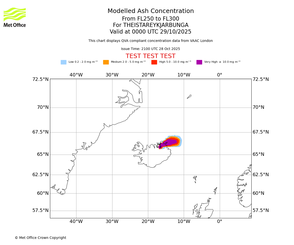 Modelled ash concentration from 250 to 300 for THEISTAREYKJARBUNGA. Valid at 2100 UTC 28/10/2025