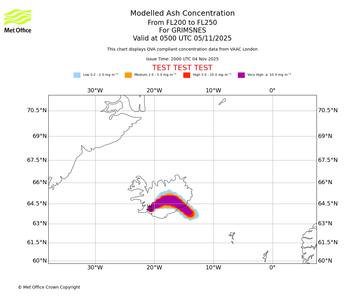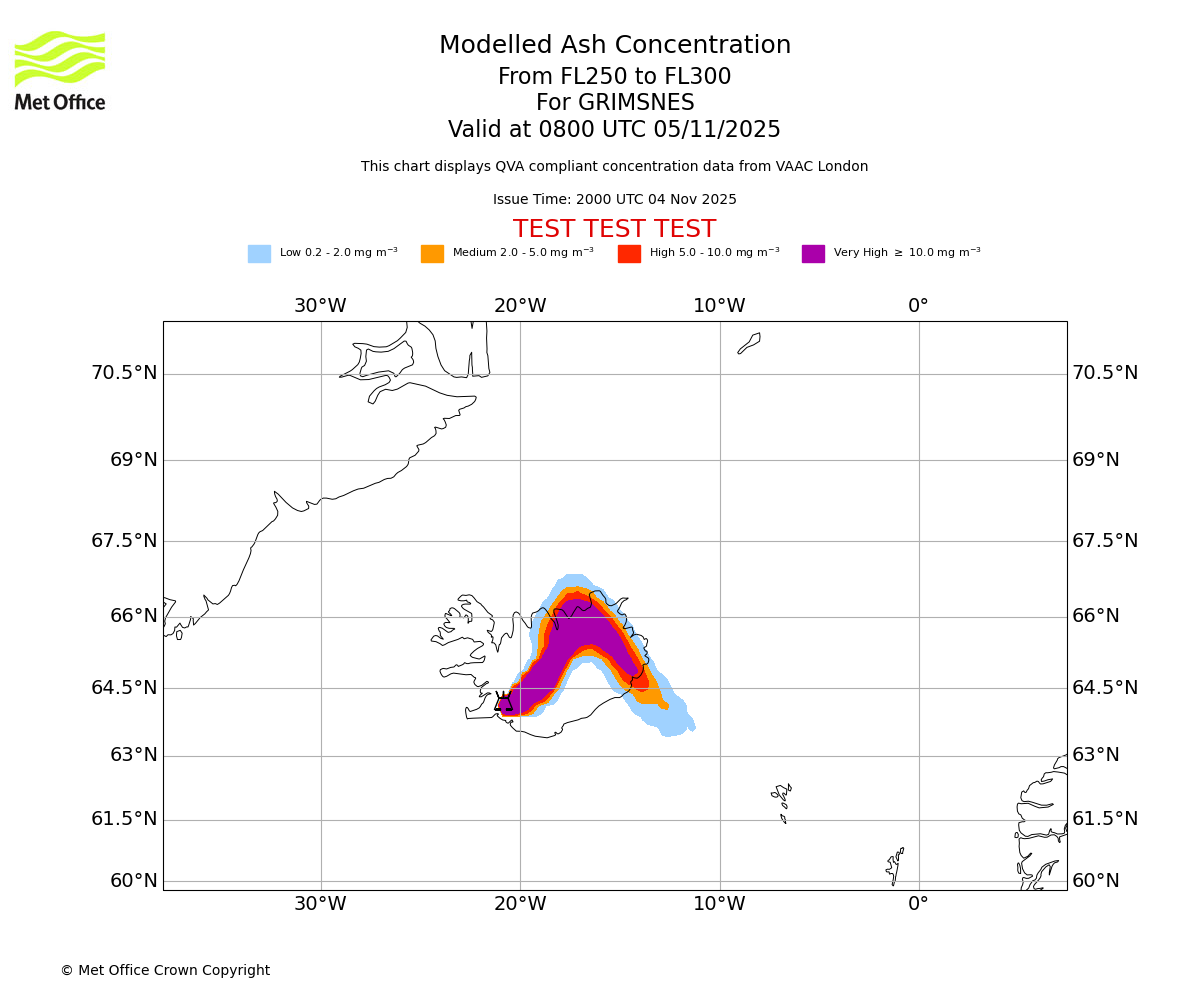 Modelled ash concentration from 250 to 300 for GRIMSNES. Valid at 0500 UTC 05/11/2025