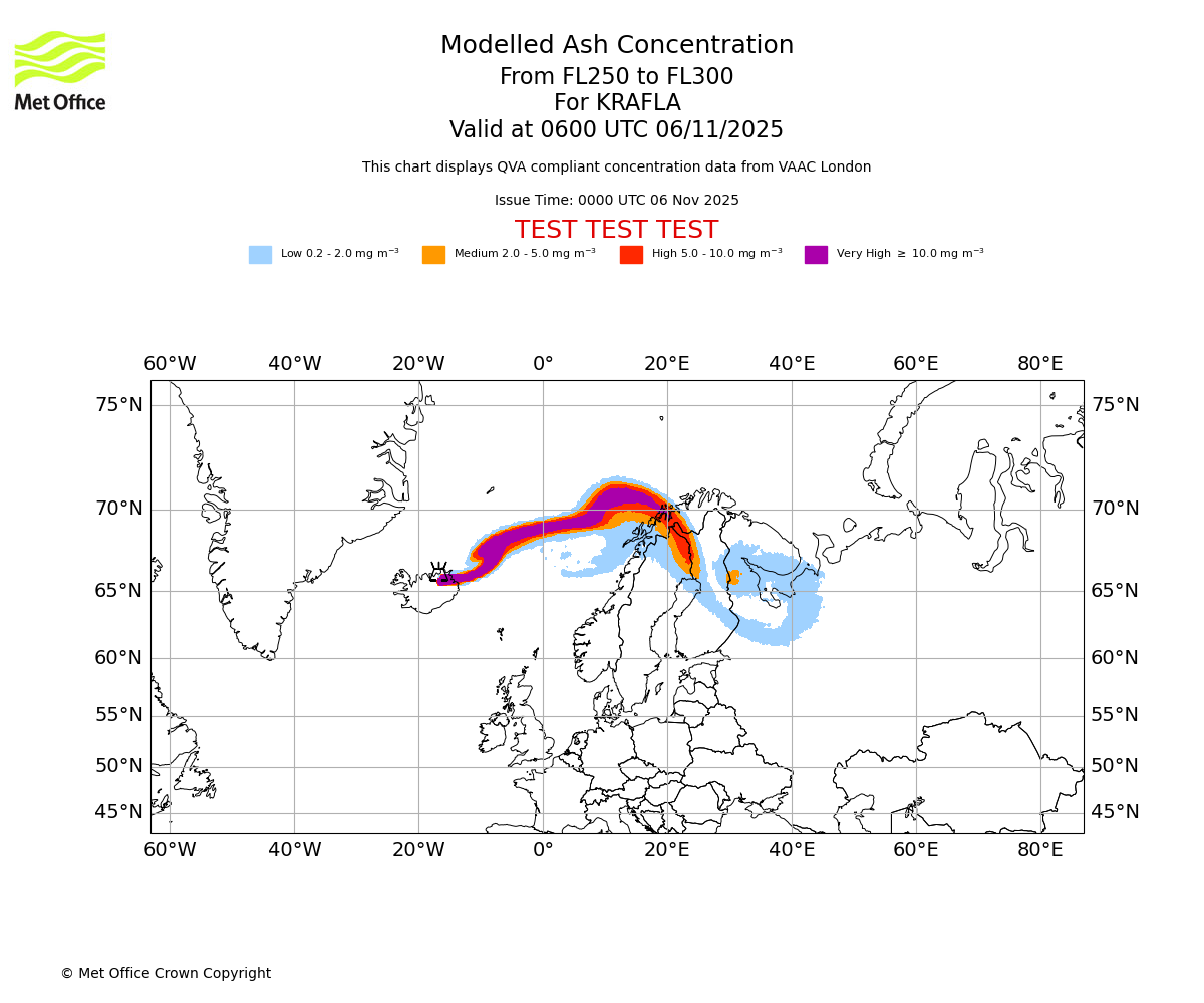 In accordance with ICAO Annex 3, Amendment 82 VAAC London will provide operational QVA forecasts from 27 November 2025 and these will be made available via a VAAC London QVA API information service. These charts are currently provided for test and evaluation purposes (not for operational use) until the introduction of the operational service.