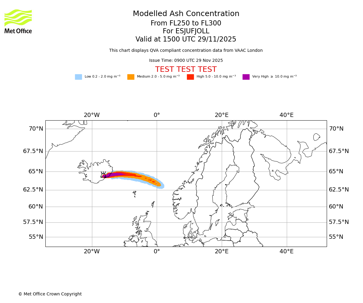 Modelled ash concentration from 250 to 300 for ESJUFJOLL. Valid at 1200 UTC 29/11/2025