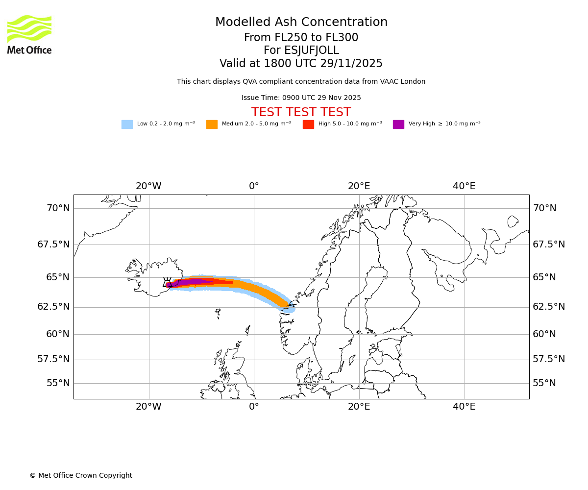 Modelled ash concentration from 250 to 300 for ESJUFJOLL. Valid at 1500 UTC 29/11/2025